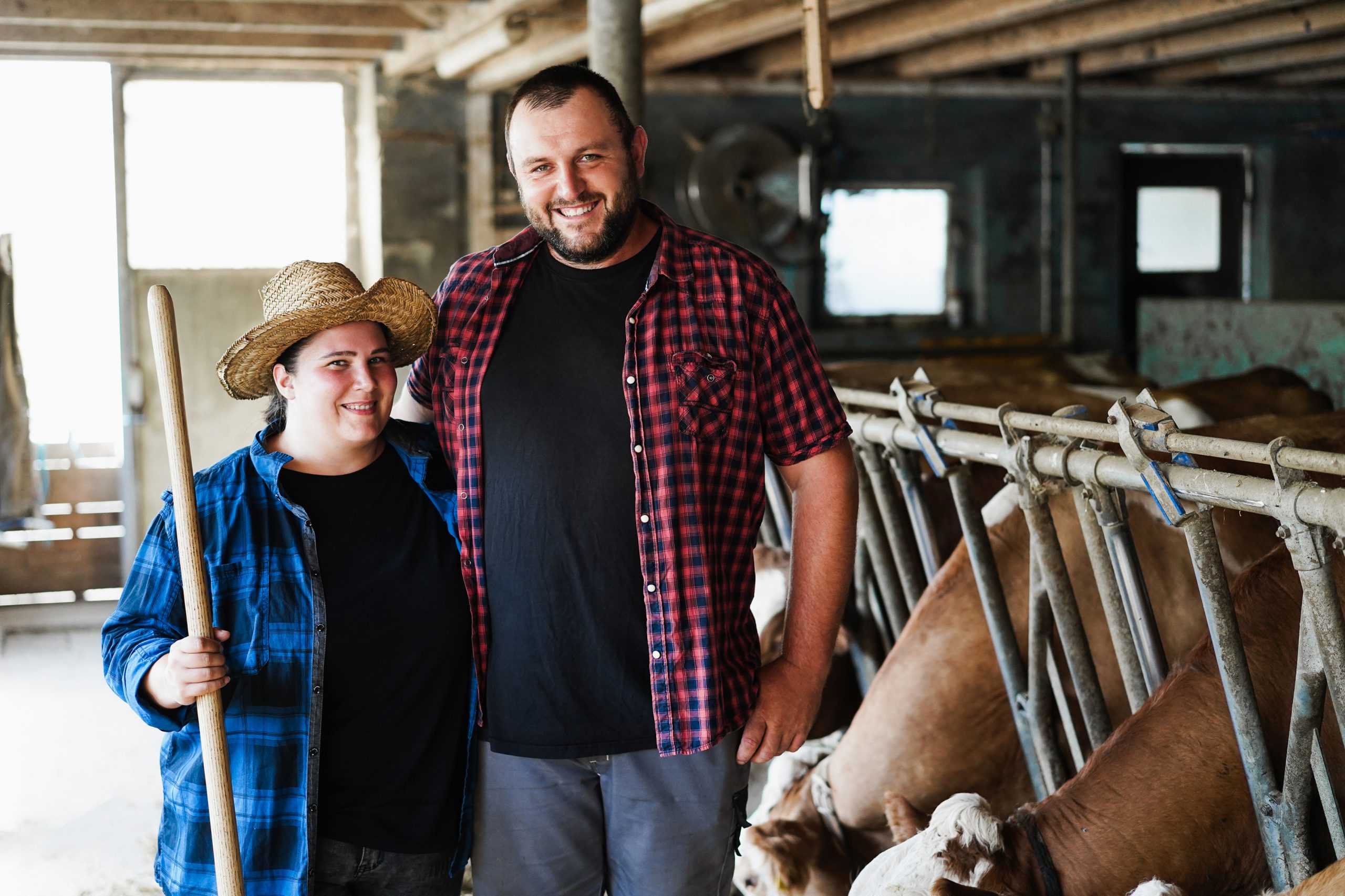 Young curvy farmers working inside cowshed – Focus on man face